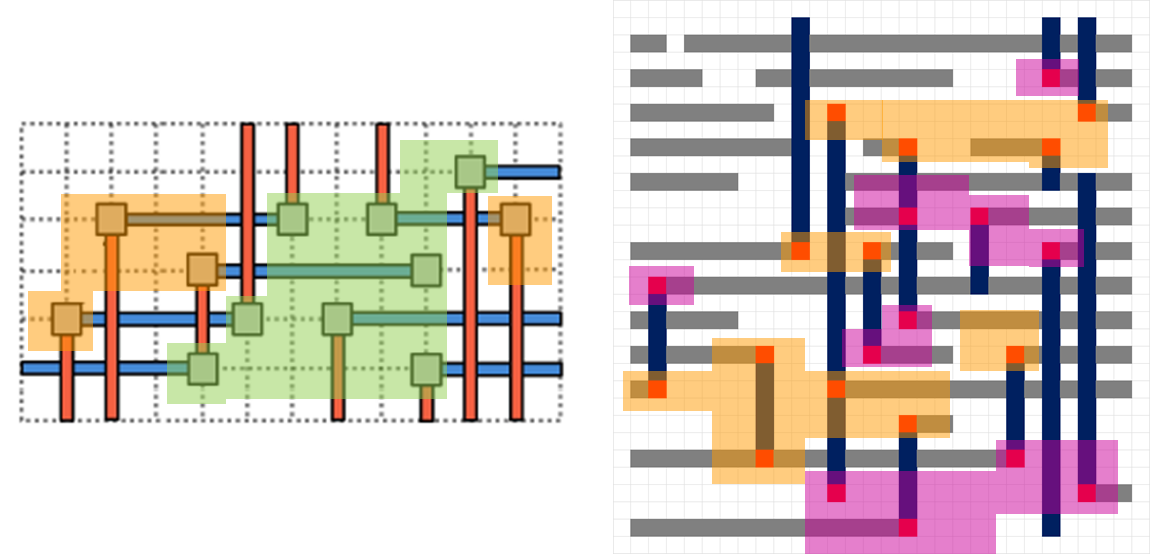Figure 4. Cut masks (each a different color) assigned to the metal layers for the layout on the right in Figure 3.