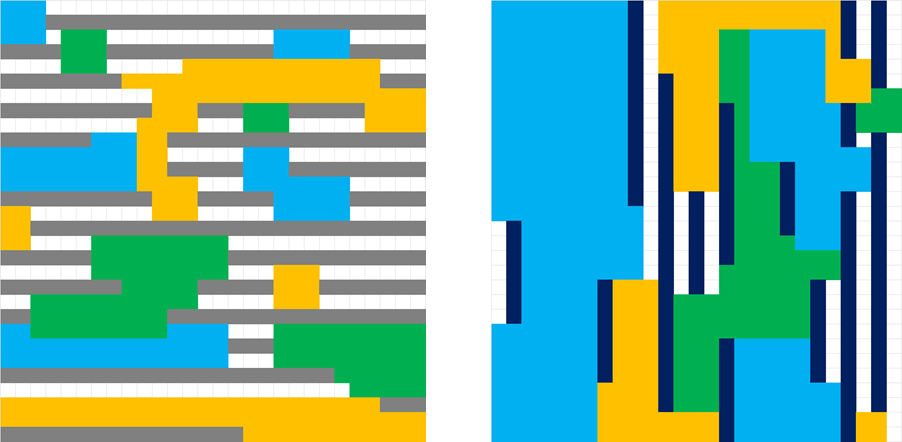 Figure 3. LELE double patterning for self-aligned via layouts where the T2T is sufficiently large. Each colored region is assigned to a designated mask. Sources: [4] (left), [5] (right). A 12 nm metal half-pitch is assumed here.