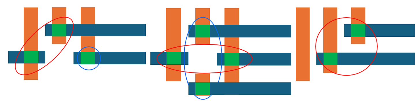 Now, with one less corner intersection of lower and upper metal layers in the vicinity, it is easy to use at most two exposures instead of three (or more) to pattern the three vias. Expanding to larger layouts, it can be shown that LELE (2x litho+etch) double patterning with ArF immersion lithography can handle realistic 3nm-level layouts (Figure 3) [4,5].