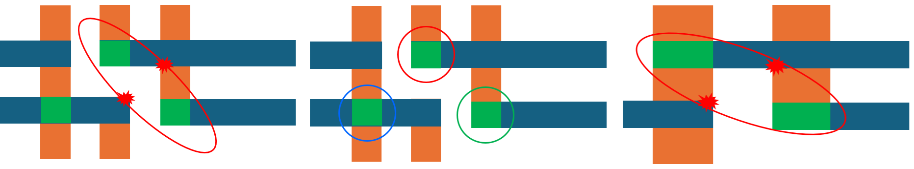 Figure 1. (Left) When the T2T equals the half-pitch, the pair of diagonal vias cannot be patterned together since the exposure area that includes them will also expose parts of FSAV locations which are not supposed to have vias. (Center) The vias shown must therefore be patterned individually, requiring (at least) three different mask exposures. (Right) Even if one of the metal pitches is expanded, if the T2T matches the expanded half-pitch, the same issue still comes up.