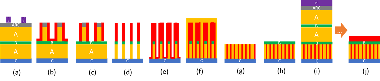 Figure 1: Steps for X-SAQP, based on Ref. [1]. (a) Deposition of process stack and 1st mandrel lithography. (b) Mandrel formation and spacer deposition. (c) Spacer etch-back. (d) Etch of underlayers to extend mandrel vertically. (e) 2nd spacer deposition. (f) Filling gaps between 2nd spacers. (g) Planarization by etch-back. (h) Coat for cross-layer patterning. (i) Deposition of 2nd process stack and 2nd mandrel lithography. (j) Repeat steps (a) through (g) in 2nd process stack.