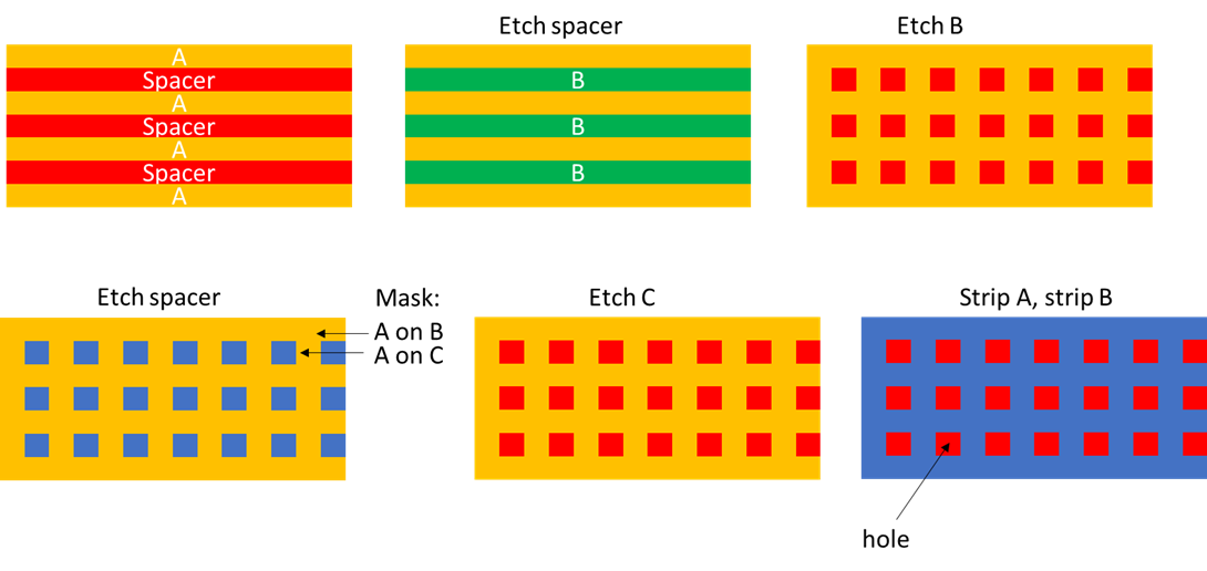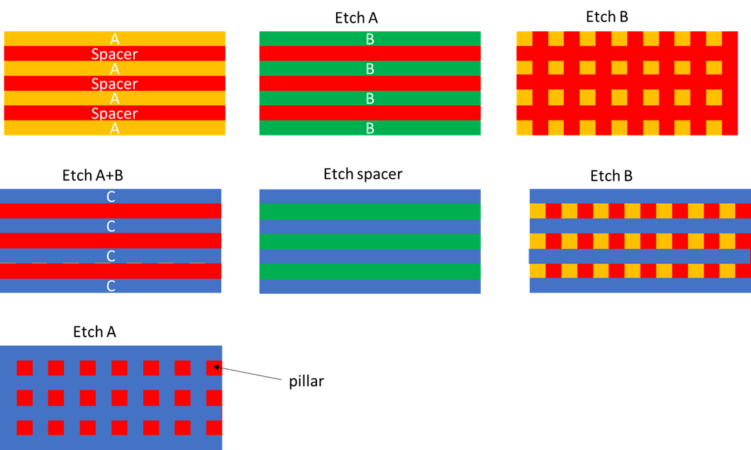 The process flow for crossed self-aligned double and quadruple patterning has already been disclosed publicly [6]. The steps for the case of X-SAQP are shown below (Figure 1) [1]. The key requirement is for the materials involved to be able to be etched selectively with respect to the others. These materials are typically selected from silicon oxide, silicon nitride, carbon, silicon, metal (e.g., TiN), and even metal oxide (e.g., Al2O3).