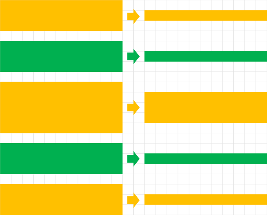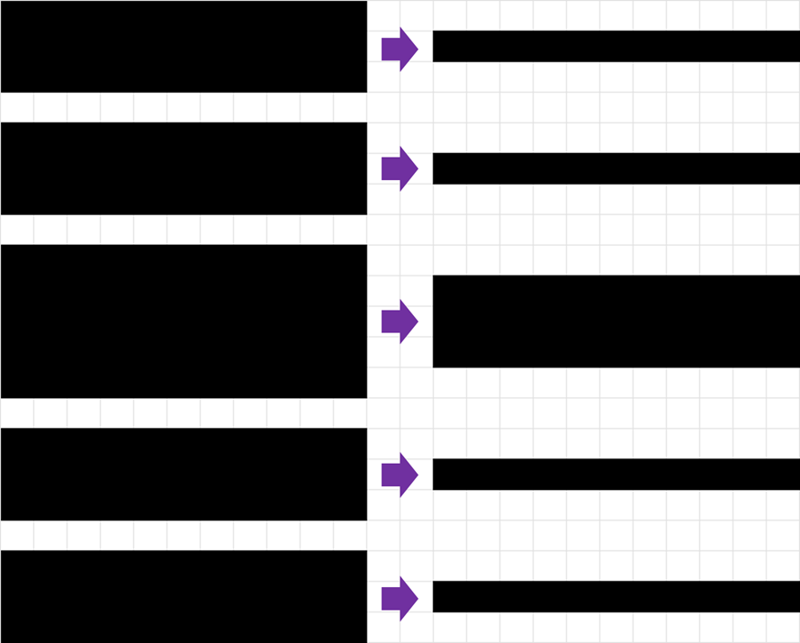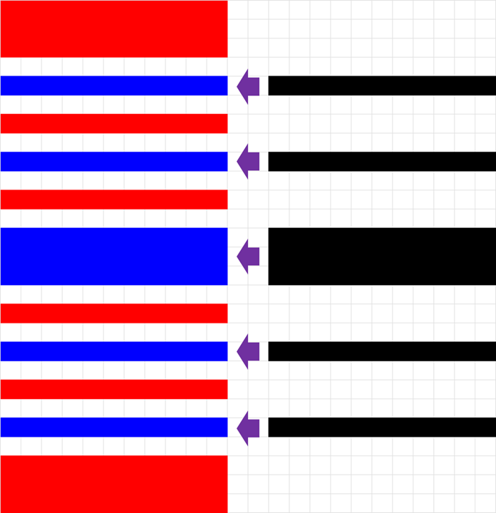 Figure 3. A 6-track cell with 10 nm half-pitch features (left) can be formed using double patterning, but a 10 nm linewidth still needs to be formed as the core (right). Note: each square represents 10 nm. The red areas are gaps which are filled after the spacers are formed.