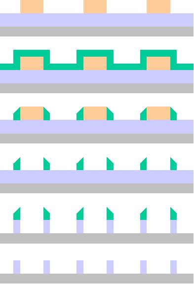 Thus, we expect that the linewidth used in double patterning will itself not be defined by direct exposure but instead by using another double patterning, specifically, self-aligned double patterning (SADP). SADP involves depositing a spacer over the mandrels, etching back to leave only the sidewalls covered, then removing the mandrels. This double the feature density, as there are two sidewall spacers per mandrel (Figure 4).
