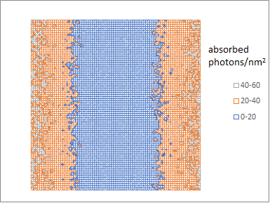 Figure 2. The stochastic appearance (i.e., absorbed photon density) of a 40 nm half-pitch image with ArF dipole illumination is negligible compared to the EUV case of Figure 1, even with a 2 mJ/cm2 absorbed dose assumed. A 6% attenuated phase-shift mask is assumed to be used for negative-tone imaging.