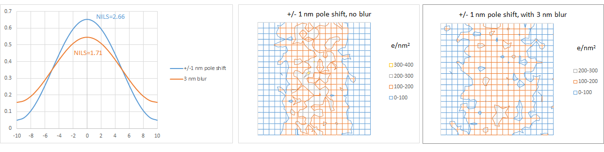 Figure 1. The stochastic appearance (i.e., scattered electron density) of a 10 nm half-pitch image is made worse with 3 nm blur, expected in metal oxide resists [2]. A 20 mJ/cm2 absorbed dose is assumed. The dipole-induced fading is modeled as a + or - 1 nm image shift for either of the two pole’s produced images.