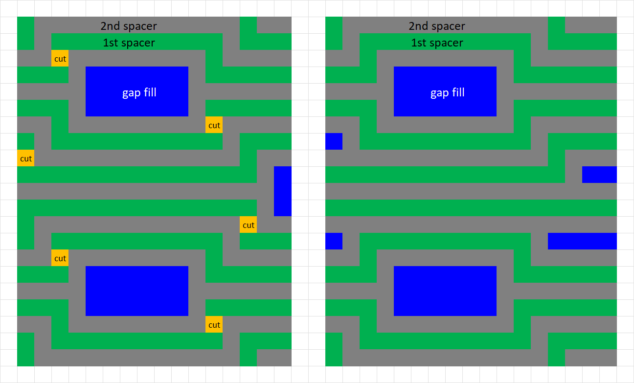 The wrapping of the lines around the islands does suggest similarity to the spacer wrapping around the core mandrel feature. Guided by the outline of the metal line directly wrapping around the islands, the appropriate mandrel features are shown in Figure 2.
