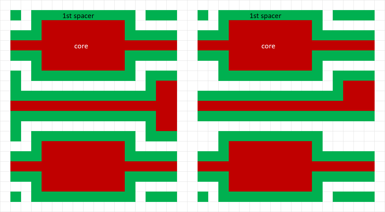 Figure 2. Core and spacer feature for the corresponding patterns in Figure 1. The spacer is deposited over the core features and then etched back, leaving only the portions on the sidewall of the core features.
