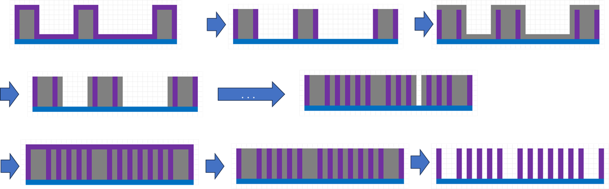 Figure 1. Multiple deposition-etch approach. Each deposition-etch iteration adds two spacers to each originally standing wide feature.