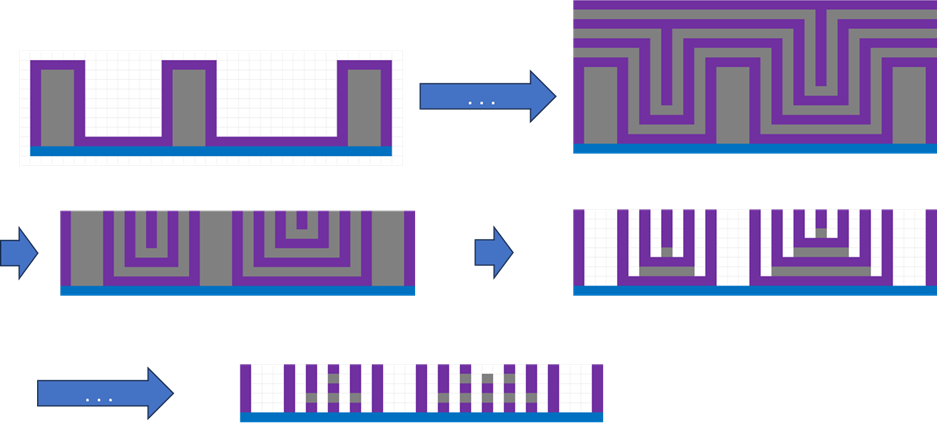 This approach avoids the horn-like appearance since there is no asymmetry from the outward facing spacer corner; each spacer top is equally surrounded on both sides. Consequently, the position of each spacer doesn’t change. On the other hand, this approach does require the starting features to be sufficiently tall so that enough alternating spacers fit in between with the conformal deposition. In the case of Figure 2, the initial features need to exceed 7 spacer layers in height. Similar to the case of the multiple deposition-etch approach above, this is linked to the largest cell height determining the required number of alternating spacer material layers.