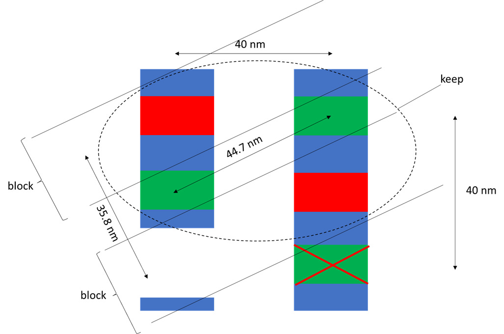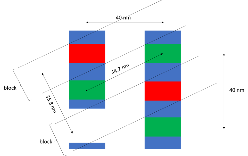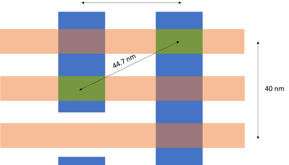 If we note the possible center-to-center distances on the crossed diagonal grid, we can see that relying on the basic repeated litho-etch (LE) approach to multipatterning will lead to up to three masks for EUV, and up to four masks for DUV, making use of an underlying 80 nm x 80 nm pitch tiling (Figure 7). The DUV LE4 approach would definitely be more cost-efficient than EUV LE3 [10]. Hence, any approach to make the requisite multipatterning more efficient, such as the diagonal line grid approach above or even directed self-assembly (DSA) [11], would help ensure getting to 20 nm track pitch and 40 nm contacted gate pitch.