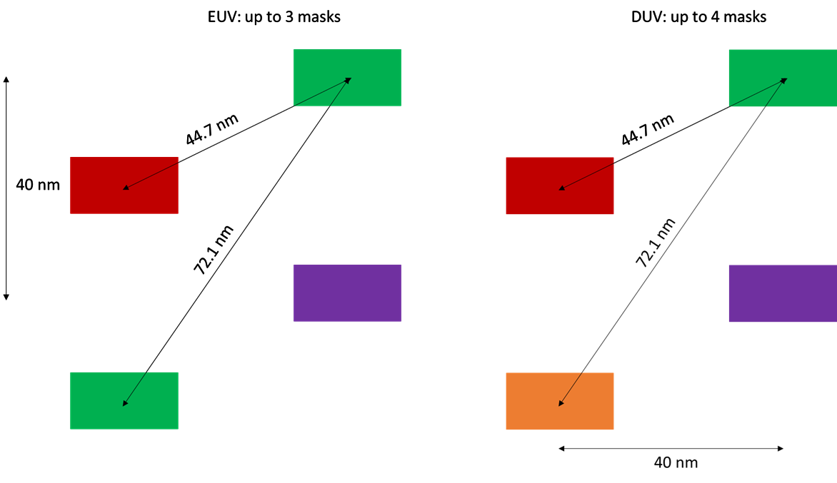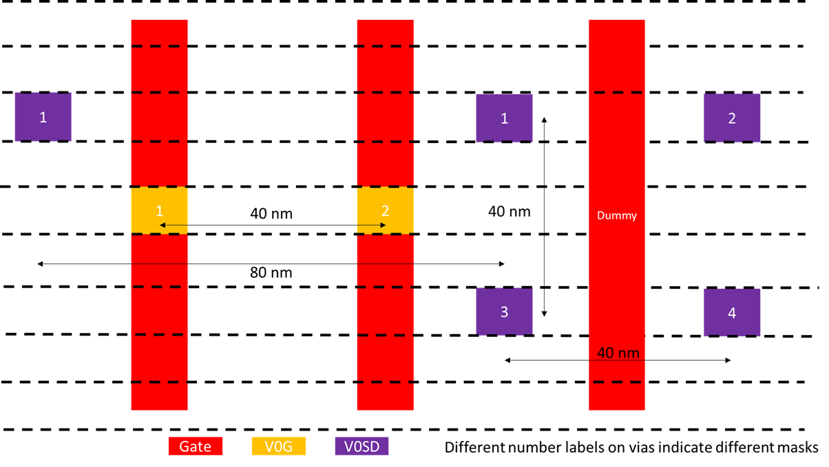 Figure 2 shows a representative layout for via connections to gates and diffusion areas, where the minimum center-to-center via spacing is 40 nm, and the track pitch is 20 nm. Due to the 40 nm minimum center-to-center spacing constraint, two masks are needed for the gate contacts, while four masks are needed for the source-drain contacts. Note, this number is the same for ArF immersion or EUV. Two vias separated by 40 nm will require two separate masks whether using DUV or EUV.