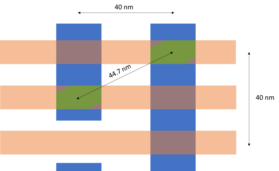 For the BEOL, we expect fully self-aligned vias to be used [5]. We can also expect vias to be placed on a crossed diagonal grid [6]. When these arrangements are combined, the number of multipatterning masks can be minimized [7]. Note that multipatterning is still necessary even with EUV as the expected center-to-center distances are still too small (Figure 3). One mask would be needed to overlay a diagonal line grid that blocks half of the crosspoint locations where the two adjacent metal layers overlap (Figure 4). The pitch of this diagonal line grid will require self-aligned quadruple patterning (SAQP) with ArF immersion lithography, and the stochastic defect density cliff below 36 nm pitch [8,9] would also likely force EUV to use self-aligned double patterning (SADP). From the remaining locations, two ArF immersion masks or one EUV mask would be used to select which ones would be kept for forming vias (Figure 5). Note that this would leave a diagonal line signature on the vias (Figure 6).
